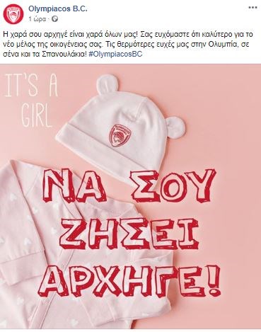 Ο Βασίλης Σπανούλης και η σύζυγός του απέκτησαν το έκτο τους παιδί και πλέουν σε πελάγη ευτυχίας. Ευχές για το νέος μέλος της οικογένειας του αρχηγού του Ολυμπιακού έστειλε η ερυθρόλευκη ΚΑΕ. «Η χαρά σου αρχηγέ είναι χαρά όλων μας! Σας ευχόμαστε ό,τι καλύτερο για το νέο μέλος της οικογένειας σας. Τις θερμότερες ευχές μας στην Ολυμπία, σε σένα και τα Σπανουλάκια!», αναφέρει η ανάρτηση της ΚΑΕ στο Facebook, που συνοδεύεται από την παρακάτω φωτογραφία.