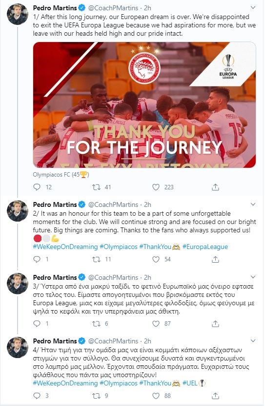 «Ύστερα από ένα μακρύ ταξίδι, το φετινό Ευρωπαϊκό μας όνειρο έφτασε στο τέλος του. Είμαστε απογοητευμένοι που βρισκόμαστε εκτός του Europa League, μιας και είχαμε μεγαλύτερες φιλοδοξίες, όμως φεύγουμε με ψηλά το κεφάλι και την υπερηφάνεια μας άθικτη. Ήταν τιμή για την ομάδα μας να είναι κομμάτι κάποιων αξέχαστων στιγμών για τον σύλλογο. Θα συνεχίσουμε δυνατά και συγκεντρωμένοι στο λαμπρό μας μέλλον. Έρχονται σπουδαία πράγματα. Ευχαριστώ τους φιλάθλους που πάντα μας υποστηρίζουν!».