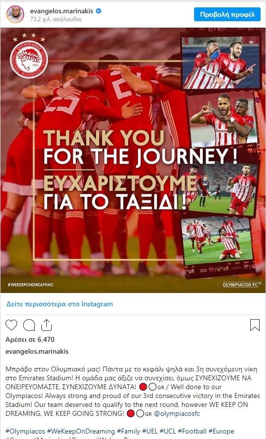 «Μπράβο στον Ολυμπιακό μας! Πάντα με το κεφάλι ψηλά και 3η συνεχόμενη νίκη στο Emirates Stadium! Η ομάδα μας άξιζε να συνεχίσει, όμως ΣΥΝΕΧΙΖΟΥΜΕ ΝΑ ΟΝΕΙΡΕΥΟΜΑΣΤΕ, ΣΥΝΕΧΙΖΟΥΜΕ ΔΥΝΑΤΑ!»