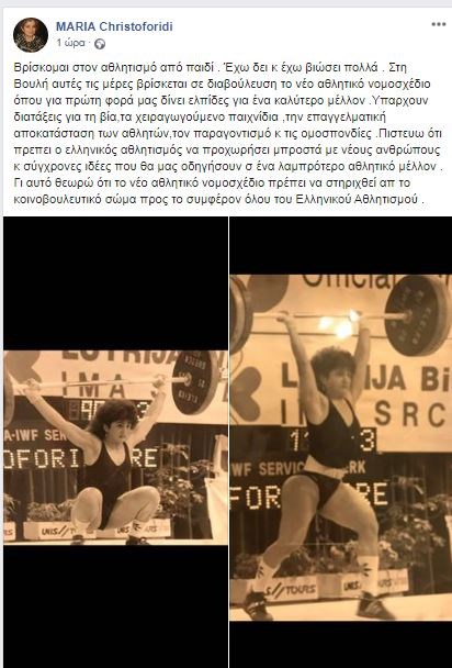 Η Μαρία Χριστοφορίδη, η παλιά αθλήτρια της άρσης βαρών, η οποία μετρά 46 μετάλλια σε διεθνείς διοργανώσεις έγραψε χαρακτηριστικά: «Βρίσκομαι στον αθλητισμό από παιδί . Έχω δει κ έχω βιώσει πολλά . Στη Βουλή αυτές τις μέρες βρίσκεται σε διαβούλευση το νέο αθλητικό νομοσχέδιο όπου για πρώτη φορά μας δίνει ελπίδες για ένα καλύτερο μέλλον .Υπάρχουν διατάξεις για τη βία,τα χειραγωγούμενο παιχνίδια ,την επαγγελματική αποκατάσταση των αθλητών,τον παραγοντισμό κ τις ομοσπονδίες .Πιστεύω ότι πρέπει ο ελληνικός αθλητισμός να προχωρήσει μπροστά με νέους ανθρώπους κ σύγχρονες ιδέες που θα μας οδηγήσουν σ ένα λαμπρότερο αθλητικό μέλλον. Γι αυτό θεωρώ ότι το νέο αθλητικό νομοσχέδιο πρέπει να στηριχθεί απ το κοινοβουλευτικό σώμα προς το συμφέρον όλου του Ελληνικού Αθλητισμού».
