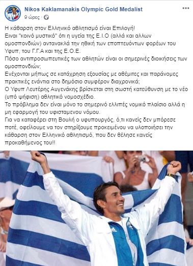 Ο Νίκος Κακλαμανάκης με ανάρτησή του στον προσωπικό του λογαριασμό στο Facebook σημείωσε: «Η κάθαρση στον Ελληνικό αθλητισμό είναι επιλογή.