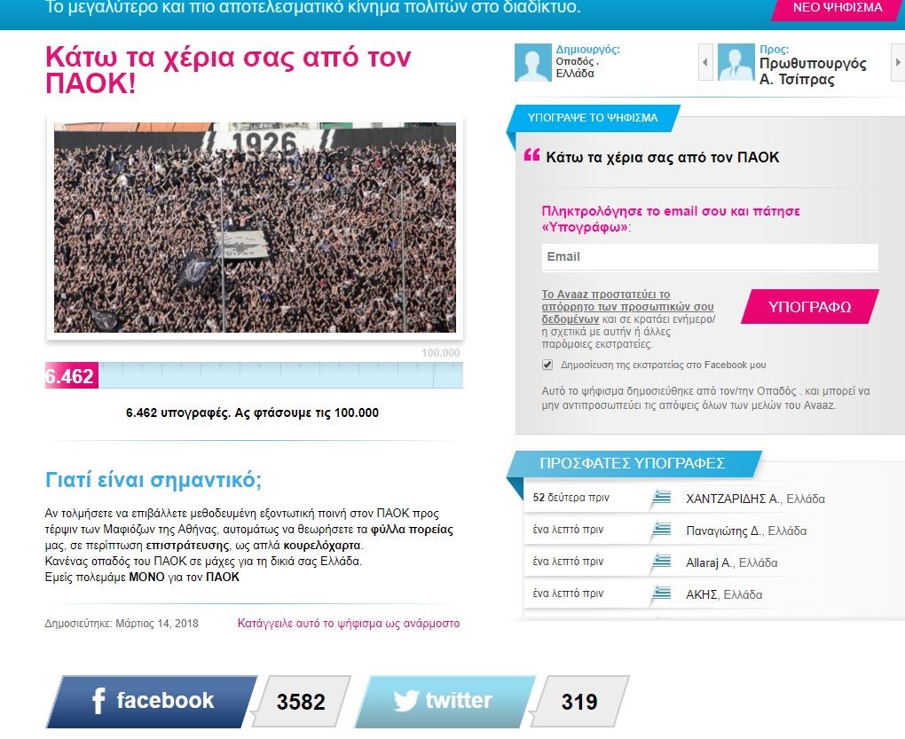 Να σημειωθεί ότι μέχρι τώρα, το συγκεκριμένο ψήφισμα έχει συγκεντρώσει 6.432 υπογραφές υποστηρικτών του δικεφάλου του Βορρά, με την προτροπή, κάτω από την φωτογραφία της κατάμεστης θύρας 4 του γηπέδου της Τούμπας, να αναφέρει: «Ας φτάσουμε τις 100.000».