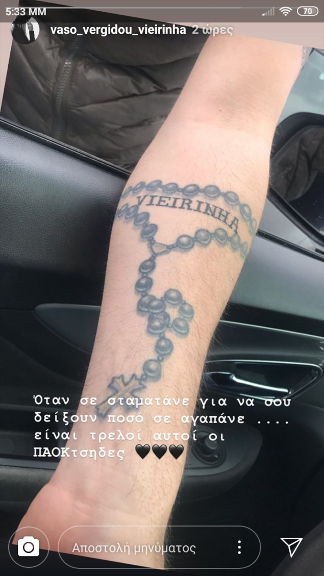 «Όταν σε σταματάνε για να σου δείξουν πόσο σε αγαπάνε… Είναι τρελοί αυτοί οι ΠΑΟΚτσήδες», ανέφερε το σχόλιο της συζύγου του Βιεϊρίνια στο instagram.