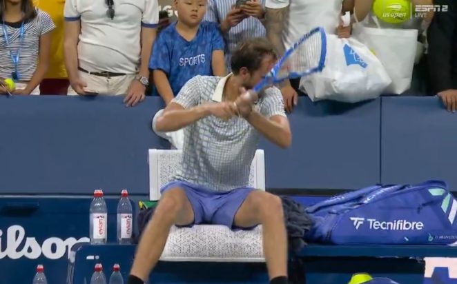 Ο Μεντβέντεφ, έξαλλος, έσπασε τη ρακέτα του και έμεινε καθισμένος για ώρα πριν αποχωρήσει.
