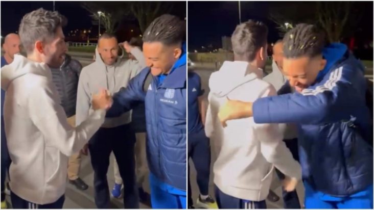 Ο… χρυσός Μίλτος Τεντόγλου υποδέχθηκε με μια μεγάλη αγκαλιά τον φίλο του και συναθλητή του, ενώ το ίδιο έκανε και ο προπονητής Γιώργος Πομάσκι.