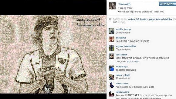 Ο πρώην άσος του ΠΑΟΚ ανέβασε ένα σκίτσο του με την φανέλα του ΠΑΟΚ, σχεδιασμένο από φίλο του “Δικεφάλου” και το συνόδευσε με το σχόλιο: “Χρόνια Πολλά για όλους. Ελευθερία ή θάνατος”.