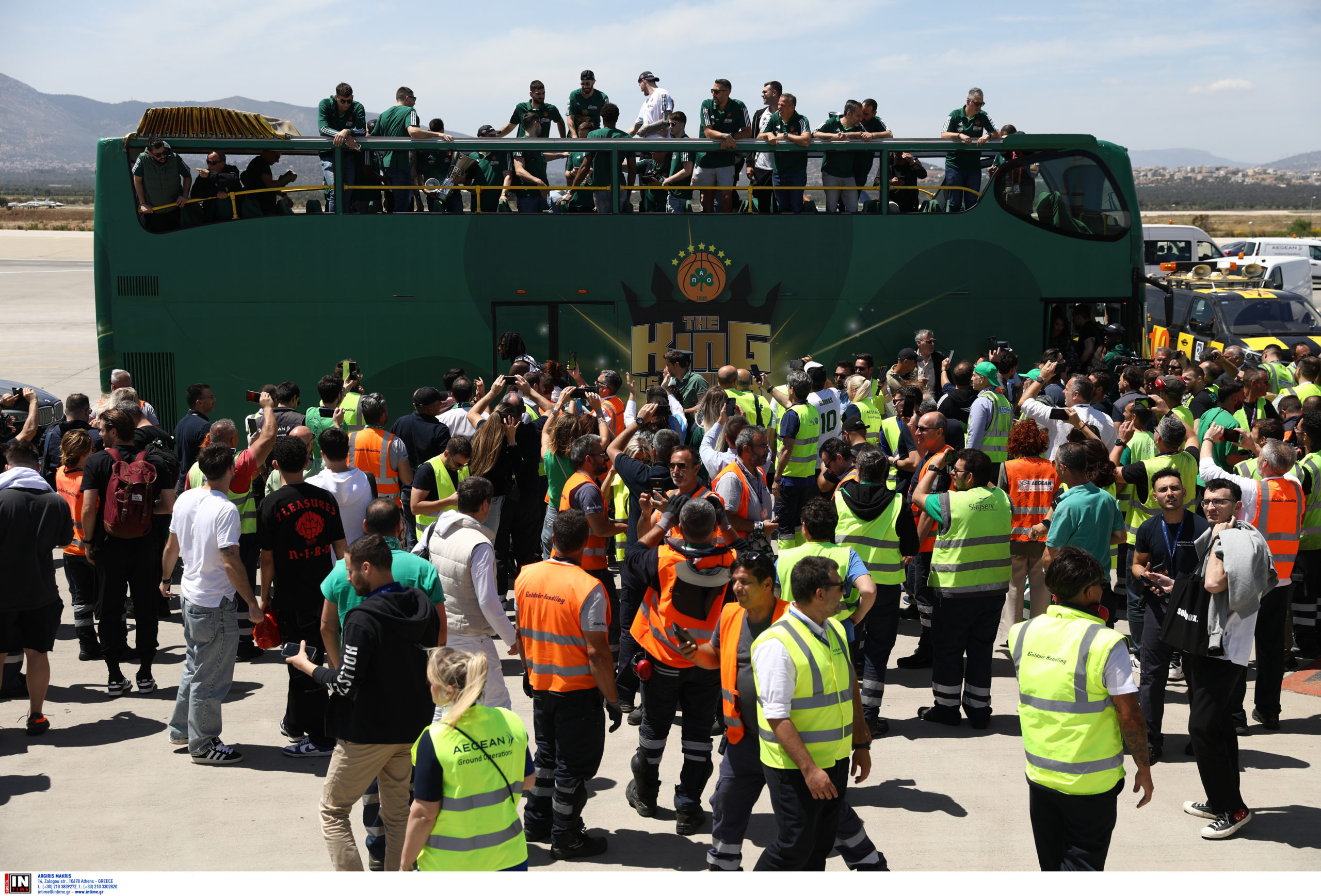 Η αποστολή εξήλθε από την Πύλη 7 (Cargo) του αεροδρομίου και επιβιβάστηκε σε ένα καταπράσινο ανοιχτό λεωφορείο, το οποίο έφερε την επιγραφή “King is Back” (σ.σ ο βασιλιάς επέστρεψε) και στο πλάι το σήμα του Παναθηναϊκού με το έβδομο αστέρι. Όταν το λεωφορείο ξεκίνησε, οι φίλαθλοι του «τριφυλλιού» επευφήμησαν τους νέους πρωταθλητές Ευρώπης, ενώ αποθέωσαν τον Κώστα Σλούκα, τραγουδώντας ρυθμικά το όνομά του.