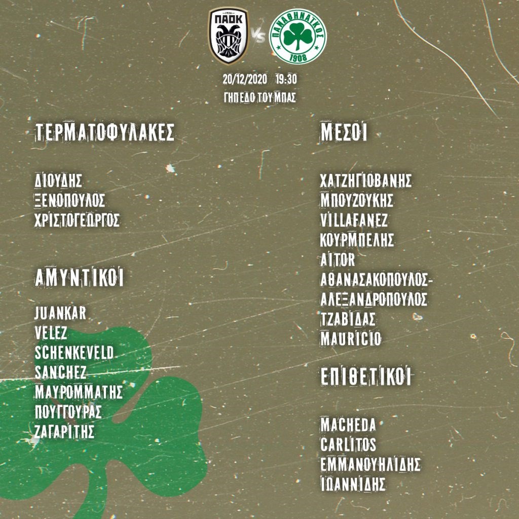 Αναλυτικά η αποστολή του Παναθηναϊκού: Διούδης, Ξενόπουλος, Χριστογεώργος, Χουάνκαρ, Βέλεθ, Σένκεφελντ, Μακέντα, Καρλίτος, Χατζηγιοβάνης, Σάντσες, Εμμανουηλίδης, Μπουζούκης, Βιγιαφάνιες, Κουρμπέλης, Αϊτόρ, Μαυρομμάτης, Ιωαννίδης, Πούγγουρας, Ζαγαρίτης, Αθανασακόπουλος, Αλεξανδρόπουλος, Τζαβίδας, Μαουρίσιο.