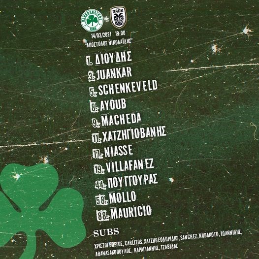 Συγκεκριμένα, ο Παναθηναϊκός θα αγωνιστεί με σύστημα 4-3-3. Ο Διούδης θα καθίσει στο τέρμα, με τους Μολό, Σένκεφελντ, Πούγγουρα και Χουάνκαρ τετράδα στην άμυνα. Νιάς, Μαουρίσιο και Αγιούμπ θα παίξουν στον άξονα, με τους Χατζηγιοβάνη, Βιγιαφάνιες στα άκρα και τον Μακέντα μοναδικό προωθημένο.