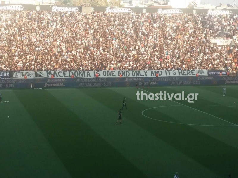 “Η Μακεδονία είναι μία και μοναδική και είναι εδώ” γράφει το πανό που έχει κρεμαστεί και πάλι μπροστά στις θύρες 5-6.