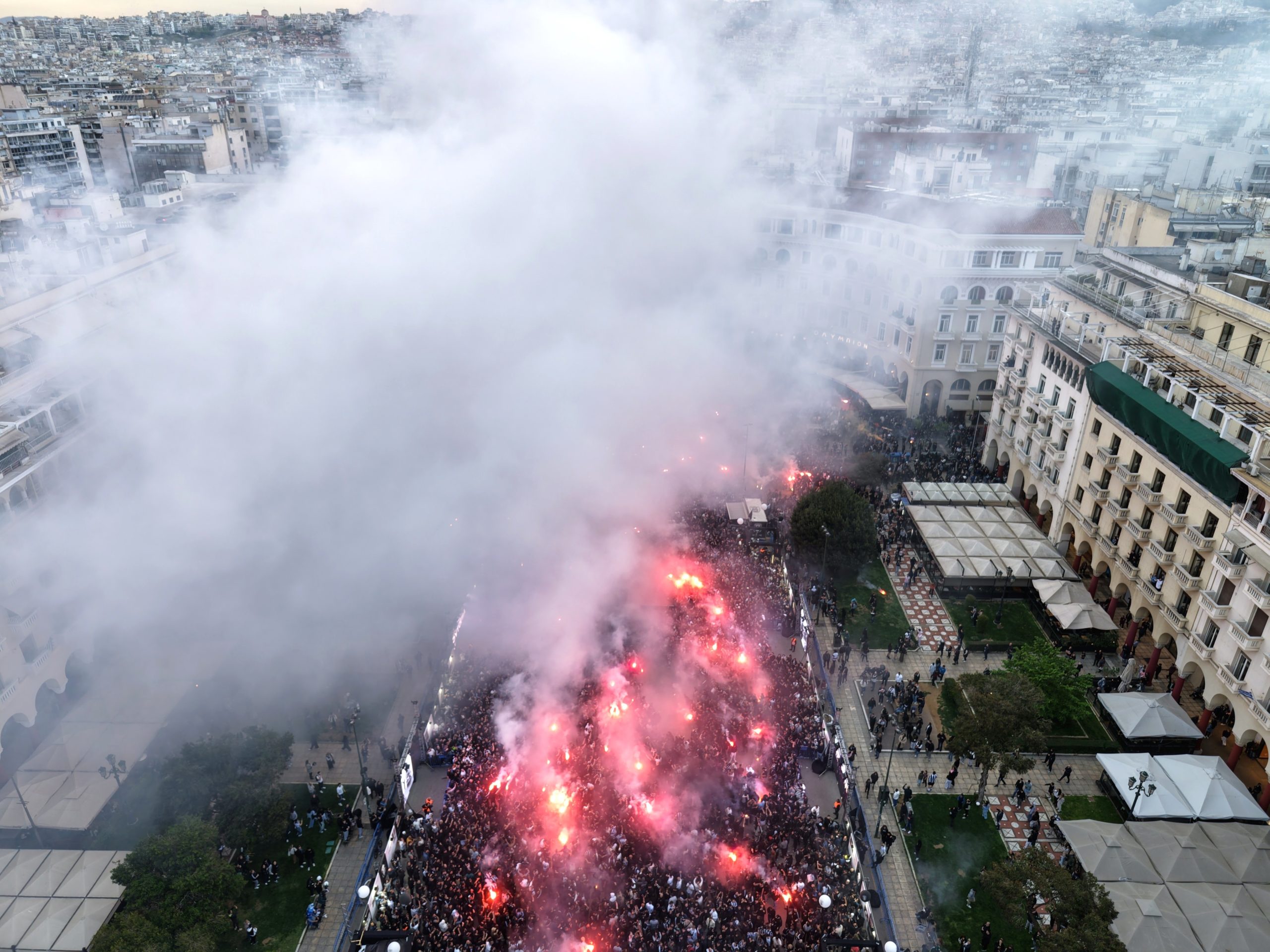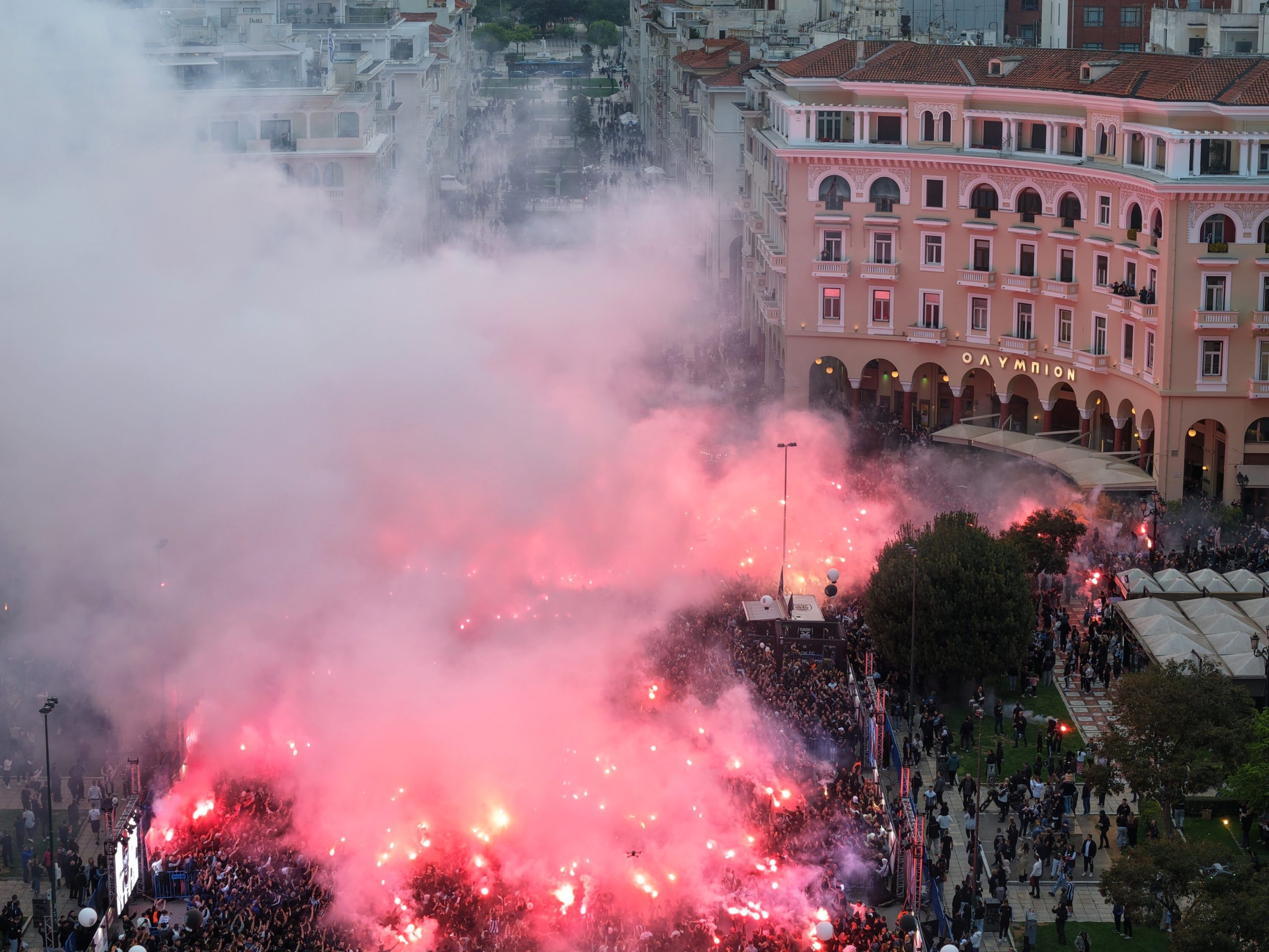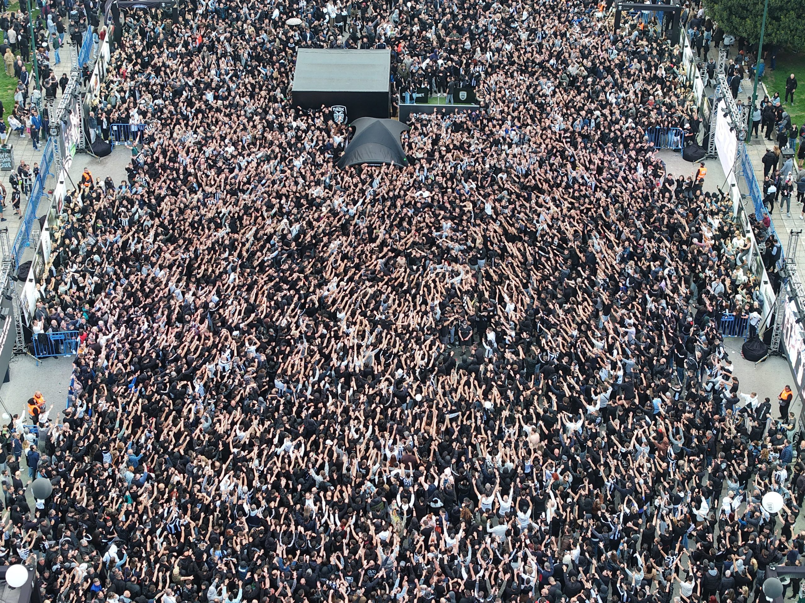 Χιλιάδες φίλοι του ΠΑΟΚ κατέκλυσαν την Πλατεία Αριστοτέλους για να γιορτάσουν τα 100 χρόνια από την ίδρυση του συλλόγου, δημιουργώντας από νωρίς ατμόσφαιρα… γηπέδου στο κέντρο της Θεσσαλονίκης. Οπαδοί κάθε ηλικίας, οικογένειες και φίλοι της ομάδας έδωσαν το «παρών» στη μεγάλη γιορτή.