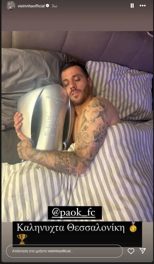 Ο Αντρέ Βιεϊρίνια φωτογραφήθηκε με το τρόπαιο του Πρωταθλητή στο κρεβάτι του και έγραψε «Καληνύχτα Θεσσαλονίκη».