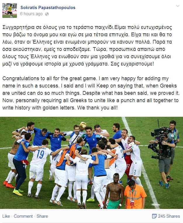 Όπως έγραψε μετά το παιχνίδι στην προσωπική του σελίδα στο facebook, «οι Έλληνες ενωμένοι μπορούν να κάνουν πολλά».