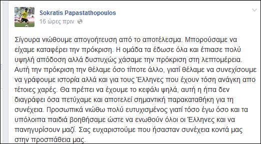 Μέσω της προσωπικής του σελίδας στο Facebook, ο Σωκράτης Παπασταθόπουλος έκανε τον απολογισμό του για την πορεία της εθνικής μας στο Μουντιάλ της Βραζιλίας, ενώ ευχαρίστησε και τους Έλληνες φιλάθλους για την στήριξή τους.