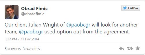 Τη λύση της συνεργασίας του πελάτη του, Τζούλιαν Ράιτ, με τον Παναθηναϊκό ανακοίνωσε ο μάνατζερ του παίκτη, Ομπραντ Φίμιτς, μέσω Τwitter.