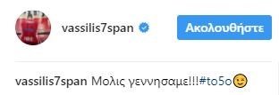 Η σύζυγός του, Ολυμπία Χοψονίδου, έφερε στον κόσμο ένα κοριτσάκι και ο Βασίλης Σπανούλης ανέβασε στον λογαριασμό του στο Instagram μια φωτογραφία με τις πατούσες της νεογέννητης κόρης του γράφοντας: «Μόλις γεννήσαμε! Το πέμπτο!».