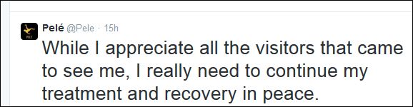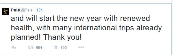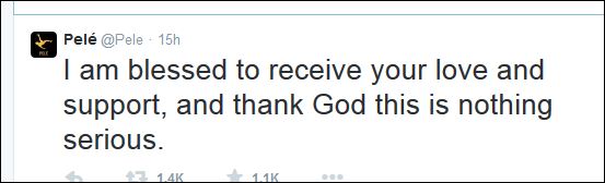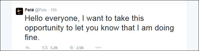 Μέσω του προσωπικού του λογαριασμού στο Twitter ο Πελέ καθησύχασε τους συμπατριώτες του και όλους τους θαυμαστές του για την κατάσταση της υγείας του. Ο Βραζιλιάνος θρύλος του παγκοσμίου ποδοσφαίρου κατέστησε σαφές ότι είναι καλά και πως δεν συντρέχει κανένας λόγος ανησυχίας.