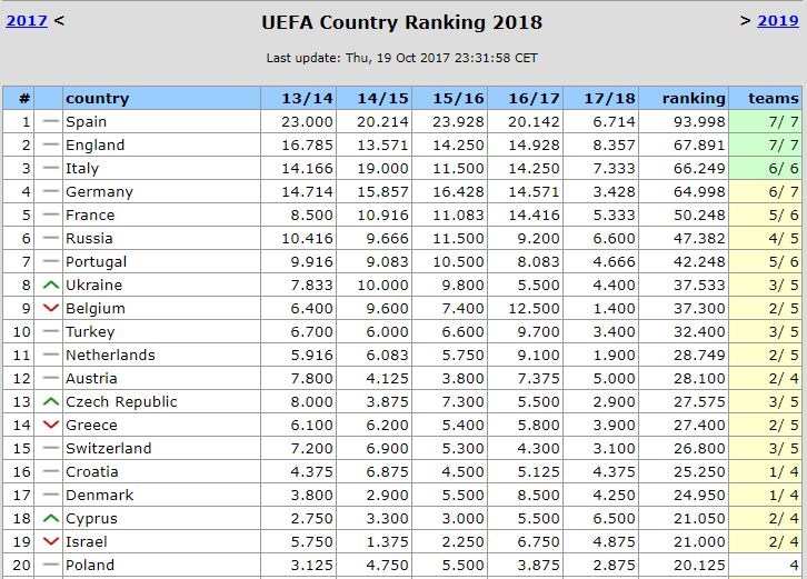 Υπενθυμίζουμε ότι όποια χώρα τερματίσει φέτος δωδέκατη, τότε την περίοδο 2019-2020 θα στείλει τον πρωταθλητή της στα πλέι οφ του Champions League και τον κυπελλούχο απευθείας στους ομίλους του Europa League.