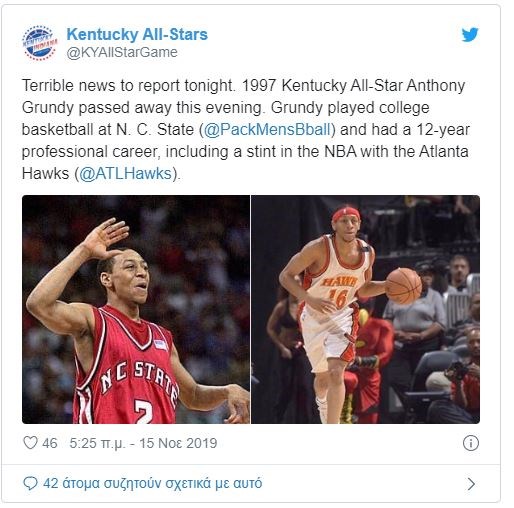 “Άσχημα νέα έχω σήμερα. Ο Άντονι Γκράντι πέθανε το απόγευμα” έγραψε μεταξύ άλλων ο Μίλερ. Ο Γκράντι ο οποίος είχε μια επαγγελματική καριέρα 12 και πλέον χρόνων, είχε περάσει από την Ελλάδα φορώντας τη φανέλα του Πανελληνίου, της ΑΕΚ αλλά και της Καβάλας.