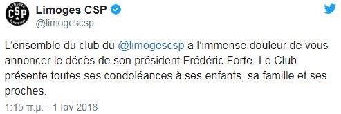 Την τελευταία του πνοή σε ηλικία 47 ετών, άφησε ο Φρεντερίκ Φορτέ. Ο πρόεδρος της Λιμόζ και επί σειρά ετών παίκτης του γαλλικού συλλόγου, απεβίωσε από ανακοπή καρδιάς, λίγες ώρες πριν τη δύση του 2017.