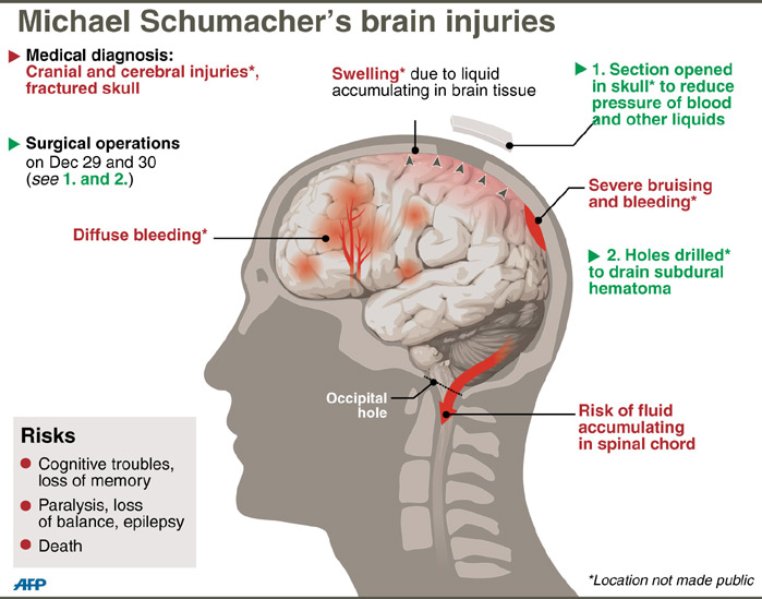 Ο Μίκαελ Σουμάχερ παραμένει σε κώμα, με το γαλλικό πρακτορείο ειδήσεων AFP να δίνει στο φως της δημοσιότητας διάγραμμα με τα πιθανά… κουσούρια που θα του αφήσει το σοβαρό ατύχημά του, εφόσον βγει νικητής από αυτή τη μάχη.