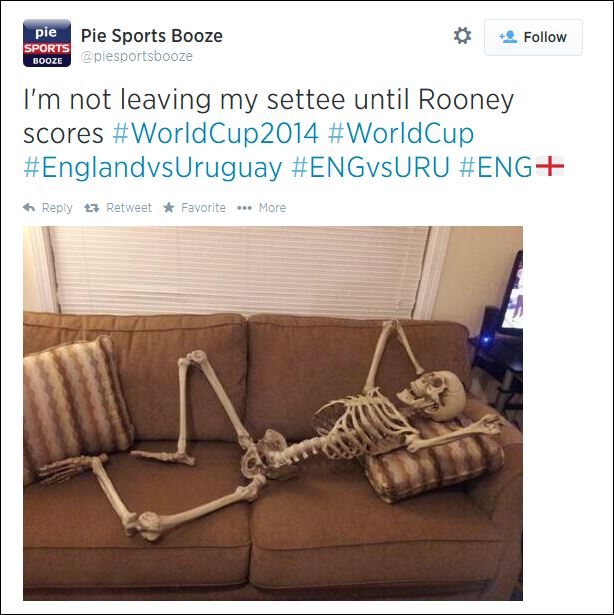 Δεν έχουν τέλος τα σχόλια των χρηστών των μέσων κοινωνικής δικτύωσης για τον διαφαινόμενο αποκλεισμό της εθνικής Αγγλίας από το Μουντιάλ της Βραζιλίας. Σκελετοί που ακόμα περιμένουν την κατάκτηση ενός τίτλου από τα «λιοντάρια», καμήλες που προβλέπουν νίκη της ομάδας του Χόντσον και πιλότοι που ζεσταίνουν τις μηχανές τους είναι μερικές από τις εμπνεύσεις των Βρετανών φιλάθλων που προσπαθούν να διασκεδάσουν τις εντυπώσεις από την παρουσία της Αγγλίας στα γήπεδα της «χώρας του καφέ».