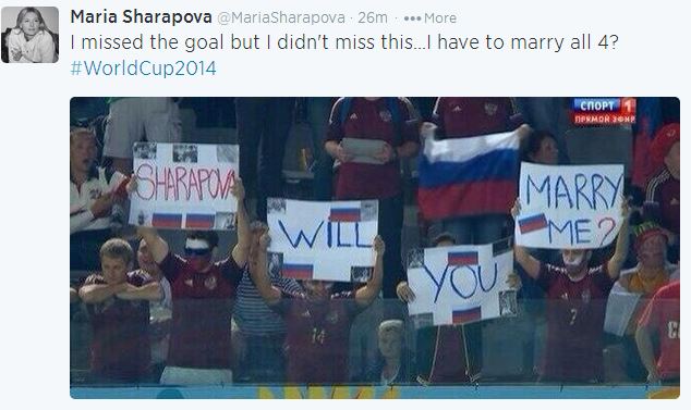 Η Ρωσία αποκλείστηκε από τη συνέχεια του Παγκοσμίου Κυπέλλου, αλλά αυτό δεν πτόησε τέσσερις θαυμαστές της Μαρία Σαράποβα να της κάνουν πρόταση γάμου. Η πανέμορφη ρωσίδα τενίστρια έχει μεγάλο fan club στη χώρα της και δέχθηκε… βροχή της προτάσεις για να ντυθεί νυφούλα. Σχολιάζοντας η ίδια, μάλιστα, στο twitter ανέφερε: «Πρέπει να παντρευτώ και τους τέσσερις;»