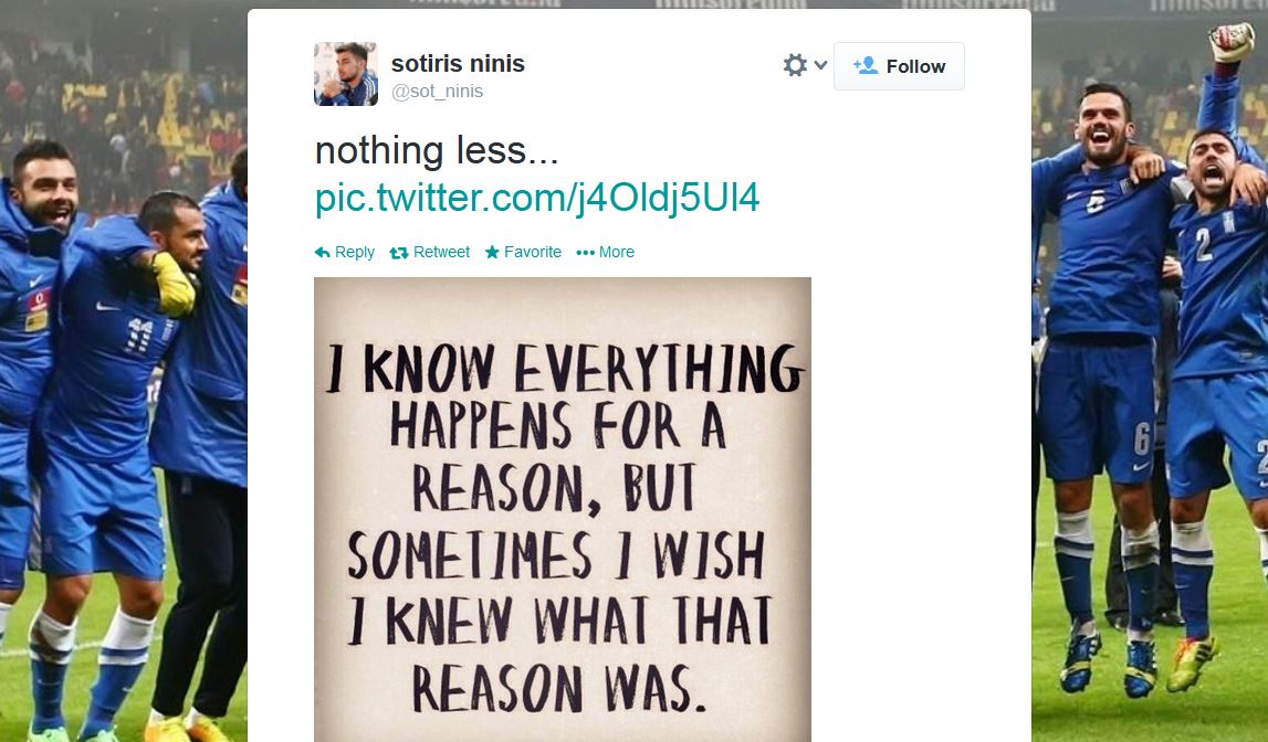Ο Νίνης ανάρτησε μήνυμα στον προσωπικό του λογαριασμό το οποίο αναφέρει: «Γνωρίζω ότι όλα γίνονται για κάποιο λόγο, κάποιες φορές όμως θα θελα να ξέρω ποιος είναι αυτός ο λόγος».