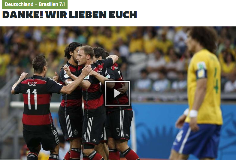 «Θαύμα» και «ιστορικό» ήταν δύο από τις λέξεις που συχνά χρησιμοποίησαν τα γερμανικά on line μέσα μαζικής ενημέρωσης για τον ιστορικό όπως εξελίχθηκε ημιτελικό του Παγκοσμίου Κυπέλλου στο Μπέλο Οριζόντε. «Απίστευτο! Γιγαντιαίο! Φανταστικό!» έγραψε η Bild στην on line διαδικτυακή έκδοσή της που είχε τίτλο «Σας ευχαριστούμε. Σας αγαπάμε».