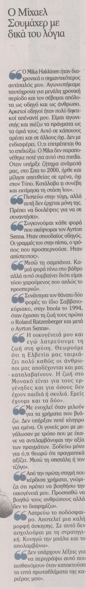 “Αυτό που με ανησυχούσε πάντα είναι η αδυναμία να βρω μια λογική εξή��ηση για μια σύγκρουση”. Η δήλωση του Μίχαελ Σουμάχερ για τη χειρότερη ανάμνησή του, στις πίστες, το ατύχημά του στην Imola το 1995, στοιχειώνει το μυαλό όσων τον βλέπουν καθηλωμένο στο κρεβάτι της εντατικής του νοσοκομείου της Γκρενόμπλ να δίνει τον σκληρότερο αγώνα της ζωής του.