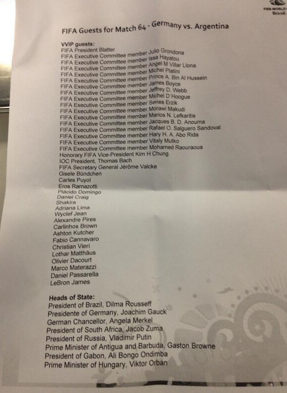 Στον Τύπο διέρρευσε η λίστα των VIP καλεσμένων της ΦΙΦΑ για τον τελικό του Παγκοσμίου Κυπέλλου. Πρόκειται, φυσικά, για τους καλεσμένους που κατάφεραν να δώσουν το παρών στο γήπεδο, δεδομένου ότι η Παγκόσμια Ομοσπονδία ποδοσφαίρου είχε καλέσει πολλούς ακόμα..