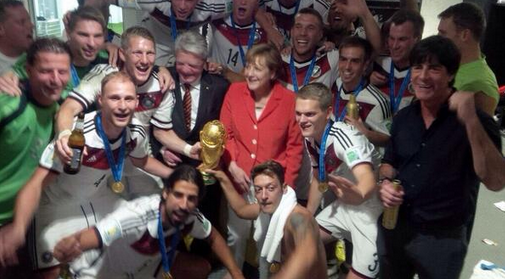 Η Άνγκελα Μέρκελ μετά την απονομή του τίτλου στη Γερμανία βρέθηκε στα αποδυτήρια των πάντσερ και μοίρασε συγχαρητήρια για την κατάκτηση του Παγκοσμίου Κυπέλλου. Η καγκελάριος της Γερμανίας, μάλιστα, φωτογραφήθηκε με τους παίκτες.