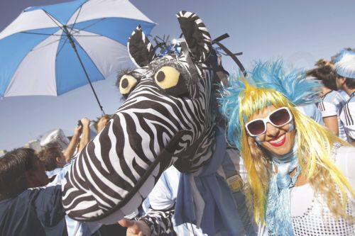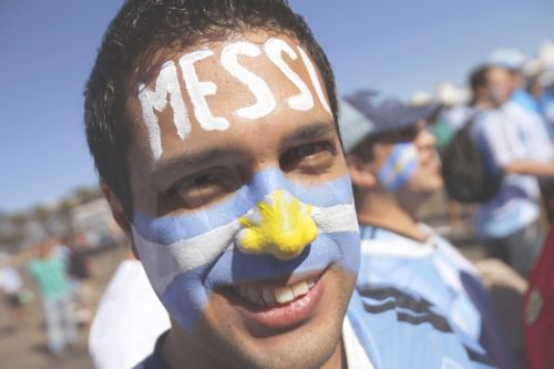Μαγνητίζουν τα βλέμματα οι φίλαθλοι της Αργεντινής που έχουν κατακλύσει το γήπεδο για τον αγώνα με το Βέλγιο. Kρατούν τεράστιες σημαίες, έχουν γράψει στα πρόσωπά τους το όνομα του σούπερ σταρ Μέσι, ενώ την παράσταση κλέβει μια… ζέμπρα που φορά την εμφάνιση της Εθνικής Ομάδας της Αργεντινής.