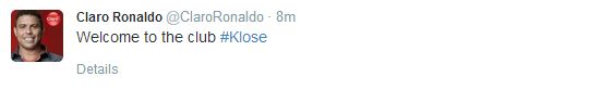 Ο Ρονάλντο, μάλιστα, αμέσως μετά το γκολ του Κλόζε καλωσόρισε στην πρώτη θέση τον Κλόζε γράφοντας στο twitter: «Welcome to the club».