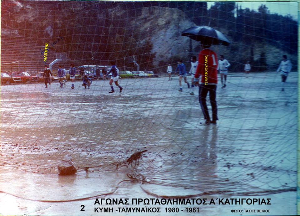 Φοβήθηκε την «βροχή» των γκολ η επέλεξε να βγάλει στεγνός το 90λεπτο; Ο τερματοφύλακας της ομάδας της Κύμης σε τοπικό ντέρμπι του 1981 άνοιξε την ομπρέλα του και αγωνίστηκε υπό την προστασία της στο υπόλοιπο ματς. Η φωτογραφία είναι από το προσωπικό αρχείο του παλαίμαχου ποδοσφαιριστή, Τάσου Βέκιου.