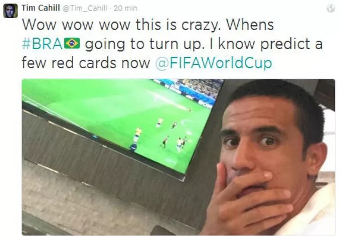 Ο Tim Cahill, έβγαλε μία selfie μπροστά στην τηλεόραση και έγραψε: «Αυτό είναι τρελό. Πότε θα επιστρέψει η Βραζιλία; Προβλέπω και μερικές κόκκινες κάρτες τώρα».