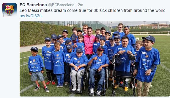 Την ευαίσθητη πλευρά του έδειξε ο Αργεντινός ποδοσφαιριστής, Λιονέλ Μέσι, καθώς φωτογραφήθηκε με 30 παιδιά που αντιμετωπίζουν πρόβλημα υγείας και επιθυμούσαν να τον συναντήσουν. Ο σούπερ σταρ της Μπαρτσελόνα δεν τους χάλασε το χατίρι όπως φαίνεται και στη στη φωτογραφία που ανήρτησε στον επίσημο λογαριασμό της στο Twitter η ομάδα της Βαρκελώνης.