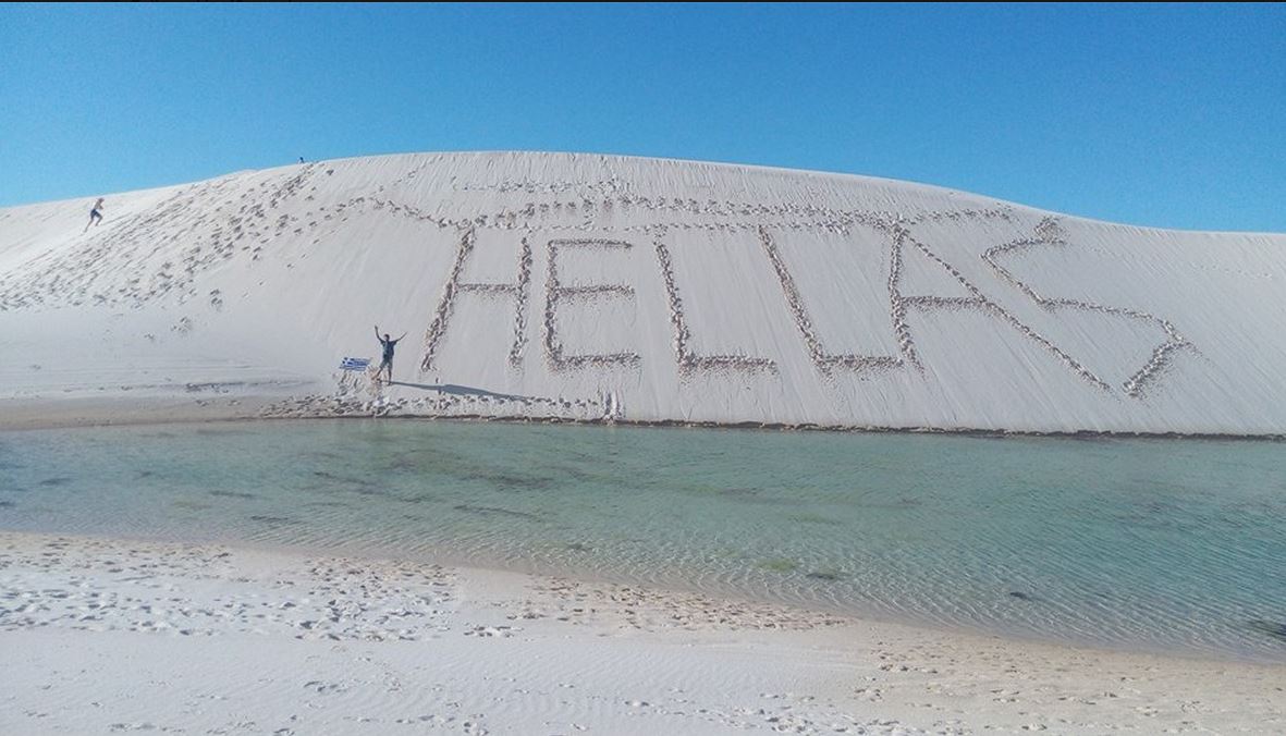 Ο Απόστολος, που διατηρεί περίπτερο στην περιοχή της Λαμίας, ξεχύθηκε στις παραλίες του Ρεσίφιε και «χάραξε» σε έναν μεγάλο αμμόλοφο το «Hellas», και μετά ανέβασε τη συγκεκριμένη φωτογραφία στον προσωπικό του λογαριασμό στο facebook.