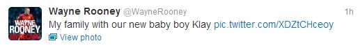 Ο άσος της Μάντσεστερ Γιουνάιτεντ, Wayne Rooney έγινε μπαμπάς για δεύτερη φορά. Η χαρά του ήταν τόσο μεγάλη, που ανέβασε φωτογραφία του νεογέννητου γιου του στο twitter.