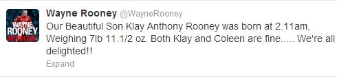 ( Ο όμορφος γιος μας Klay Anthony Rooney γεννήθηκε στις 2.11 π.μ Και ο Klay και η Coleen είναι εντάξει. Είμαστε ευτυχισμένοι).