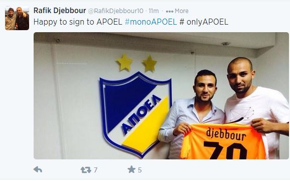 Στον ΑΠΟΕΛ θα συνεχίσει την καριέρα του ο Αλγερινός επιθετικός, Ραφίκ Τζιμπούρ, και όπως φαίνεται και στην φωτογραφία που ανήρτησε στον προσωπικό του λογαριασμό στο Twitter, «πρόβαρε» με την εμφάνιση της νέας του ομάδας, γράφοντας μάλιστα ότι είναι ιδιαίτερα «χαρούμενος».