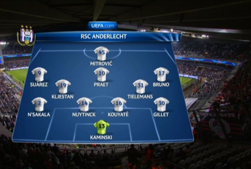 Άντερλεχτ: Καμίνσκι, Ενσακαλα, Νούιτινκ. Κουγιατέ, Πραετ, Κλάιεσταν, Ζιλέτ, Τίλεμανς, Σουάρεζ, Μπρούνο, Μίτροβιτς.
