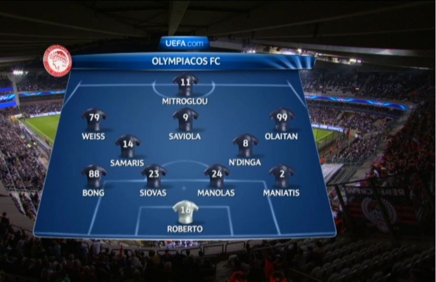 Ολυμπιακός: Ρομπέρτο, Μανιάτης, Μανωλάς, Σιόβας, Μπονγκ, Σάμαρης, Εντινγκά, Βάις, Ολαϊτάν, Σαβιόλα, Μήτρογλου.