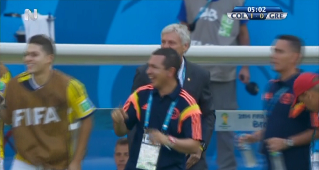Ξέφρενοι ήταν οι πανηγυρισμοί των Κολομβιανών παιχτών μετά την επίτευξη του γκολ κόντρα στην Εθνική Ελλάδας. Το ίδιο κλίμα επικράτησε και στο πάγκο της Εθνικής Κολομβίας, τόσο από τον προπονητή της ομάδας όσο και από τους αναπληρωματικούς.
