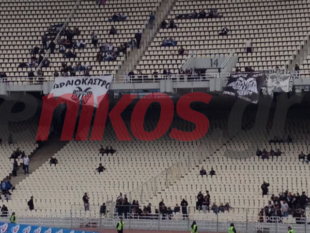 Ο τελικός του κυπέλλου θα ξεκινήσει στις 20.00, αλλά ήδη οι πρώτοι οπαδοί του ΠΑΟΚ βρίσκονται στις θέσεις τους στις εξέδρες του ΟΑΚΑ και έχουν τοποθετήσει τα πανό τους.