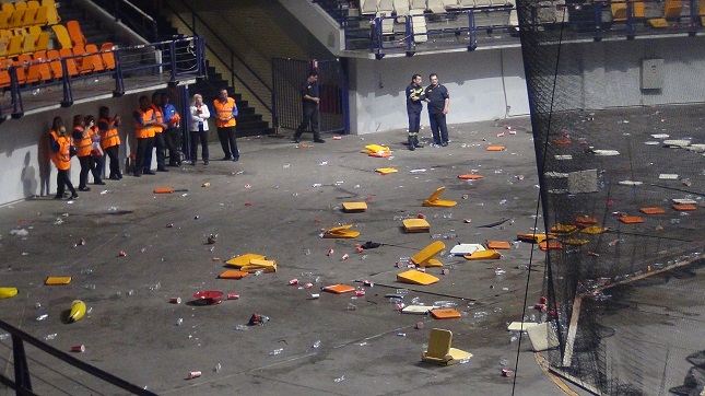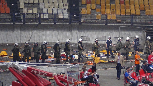 Δείτε την τραγική εικόνα του ΣΕΦ μετά τα επεισόδια στον τρίτο τελικό της Α1 ανάμεσα σε Ολυμπιακό και Παναθηναϊκό.