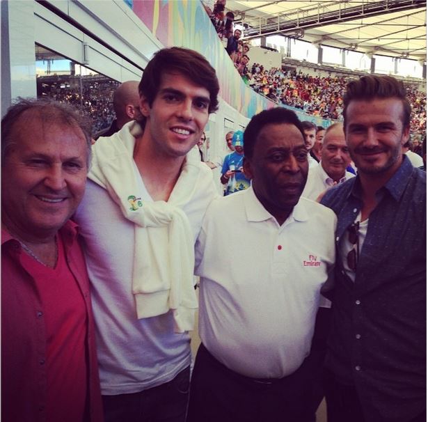Τέσσερις θρύλοι του ποδοσφαίρου συναντήθηκαν στις κερκίδες του Μαρακανά κατά τη διάρκεια του χθεσινού τελικού του Μουντιάλ. Ζίκο, Κακά, Πελέ και Μπέκαμ πόζαραν χαμογελαστοί στο φωτογραφικό φακό.