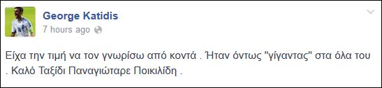 Την συγκίνηση του από την απώλεια του Παναγιώτη Ποικιλίδη εξέφρασε και ο Γιώργος Κατίδης γράφοντας στον προσωπικό του λογαριασμό στο Facebook.