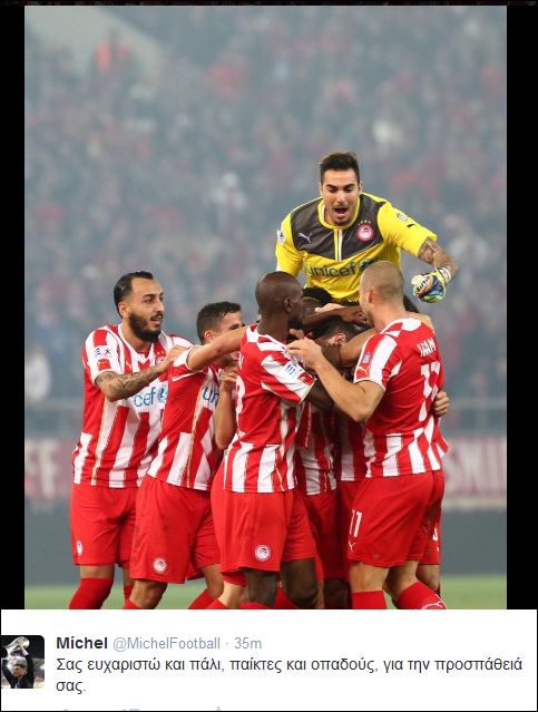 Ο Μίτσελ ανέβασε στο Twitter μια φωτογραφία με τους παίκτες του να πανηγυρίζουν το γκολ του Αυλωνίτη στο ντέρμπι με τον Παναθηναϊκό και τους ευχαρίστησε για τη νίκη, όπως και τους οπαδούς. “Σας ευχαριστώ και πάλι, παίκτες και οπαδούς, για την προσπάθειά σας”, έγραψε ο Ισπανός τεχνικός των πρωταθλητών Ελλάδος. Ο Μίτσελ έγραψε το ίδιο… μήνυμα και στα αγγλικά και στα ισπανικά, όπως κάνει πάντα.