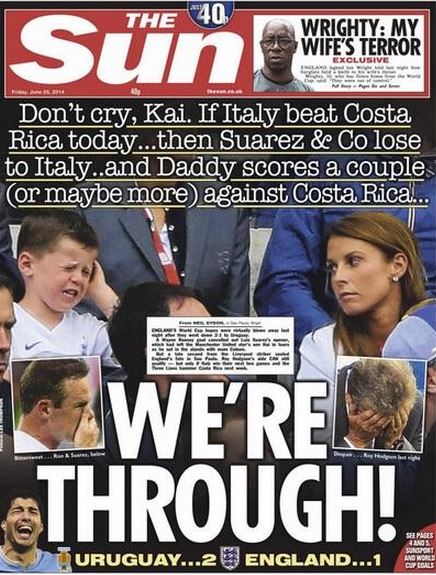 Όπως βλέπετε παρακάτω στην πρώτη σελίδα της εφημερίδας διακρίνεται ο γιος του Ρούνεϊ να κλαίει και ακολουθεί το… πολύ καυστικό σχόλιο: «Μην κλαις Kai. Αν η Ιταλία νικήσει την Κόστα Ρίκα και μετά ο Σουάρες και η παρέα του χάσουν από την Ιταλία και ο μπαμπάς σου σκοράρει δύο (ή και περισσότερα γκολ) κόντρα στην Κόστα Ρίκα, τότε θα περάσουμε…»